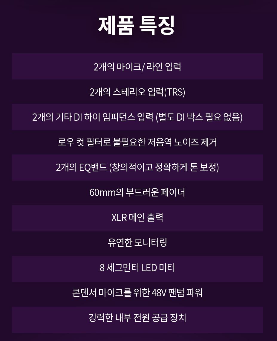 제품의 특징이라면 사진 상단에 기타 이미지의 경우 DI 하이 임피던스 입력이 내장되어 별도의 다이렉트 박스 없이 사용할 수 있으며, HF/LF의 2개의 EQ지원 그리고 +48V 팬텀 파워 지원과 그리고 TAP TEMPO 기능을 지원하는 심플한 형태의 아날로그 믹스로 디자인되어 있습니다.