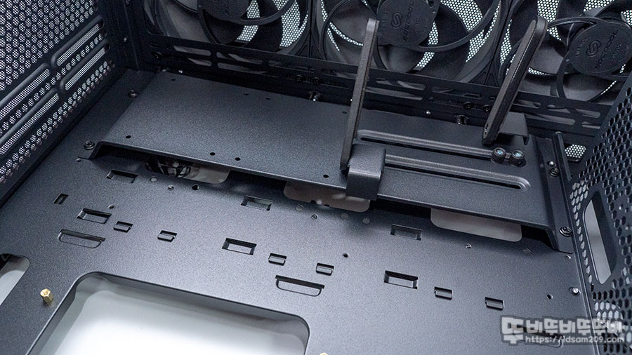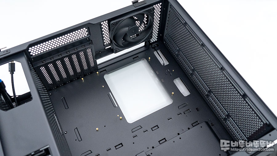 타공으로 처리된 샤시 바닥면은 케이블 정리를 위한 홀과 120mm 쿨링 장착이 가능한 가이드 홀을 확인할 수 있었습니다.