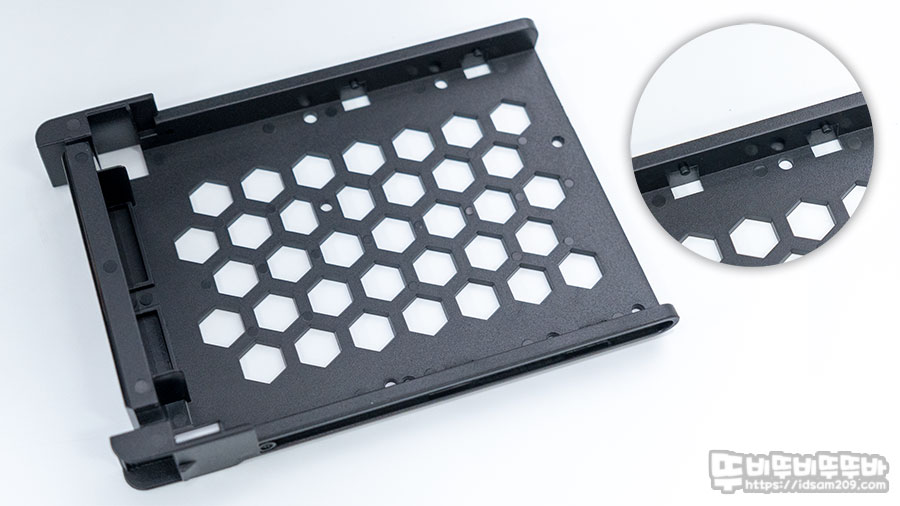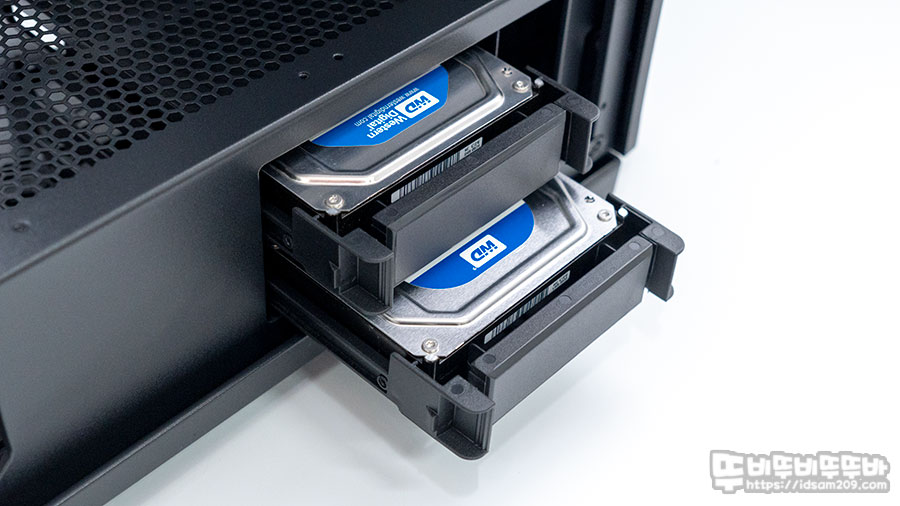 전면으로 탈거하는 HDD/SSD 가이드는 가이드 측면에 고정 핀 부분을 살짝 당겨 HDD를 장착하게 되며 SSD는 바닥면에 SSD 홀에 고정나사를 이용하여 고정하게 됩니다.
