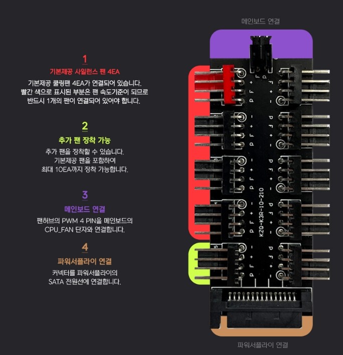 3RSYS J740 Quiet 미들타워 케이스에 기본으로 제공되는 팬 허브는 제품의 상세 설명에서 강조하는 대로 레드 컬러로 구분되는 커넥터가 팬 속도의 기준이 되기에 꼭 연결되어야 하며 SATA 전원 그리고 허브 상단에 메인보드 SYS FAN 커넥터 연결을 하게 되지만 쿨링팬이 많이 연결된 경우 전체적인 전류를 생각하여 AIO PUMP 커넥터를 이용하기 바랍니다.