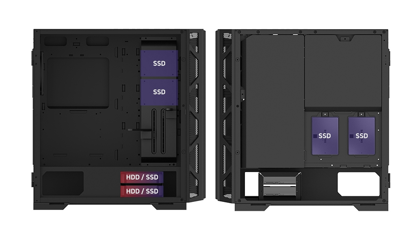 샤시 뒷면에는 SSD 장착을 위한 가이드 그리고 하단부에는 파워서플라이 장착 공간과 전면에서 장착이 가능한 HDD/SSD 가이드 모습을 확인할 수 있습니다.