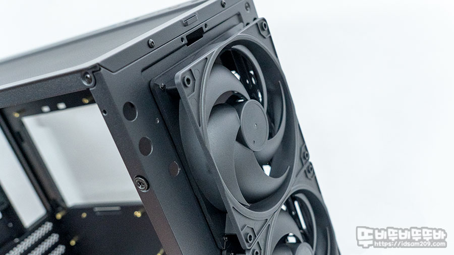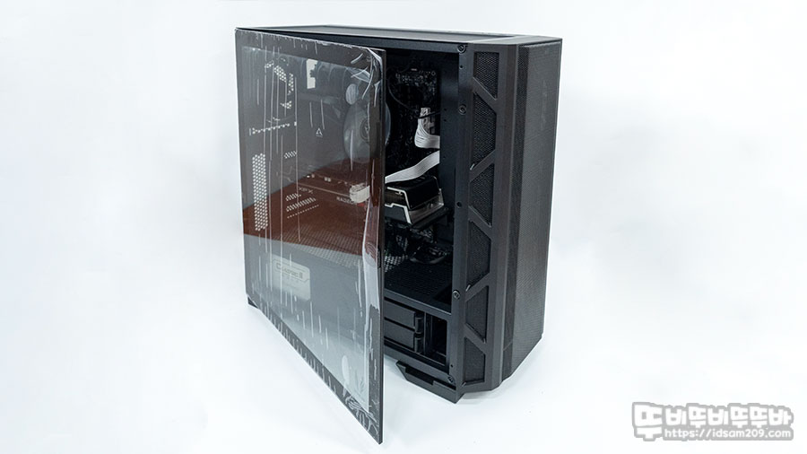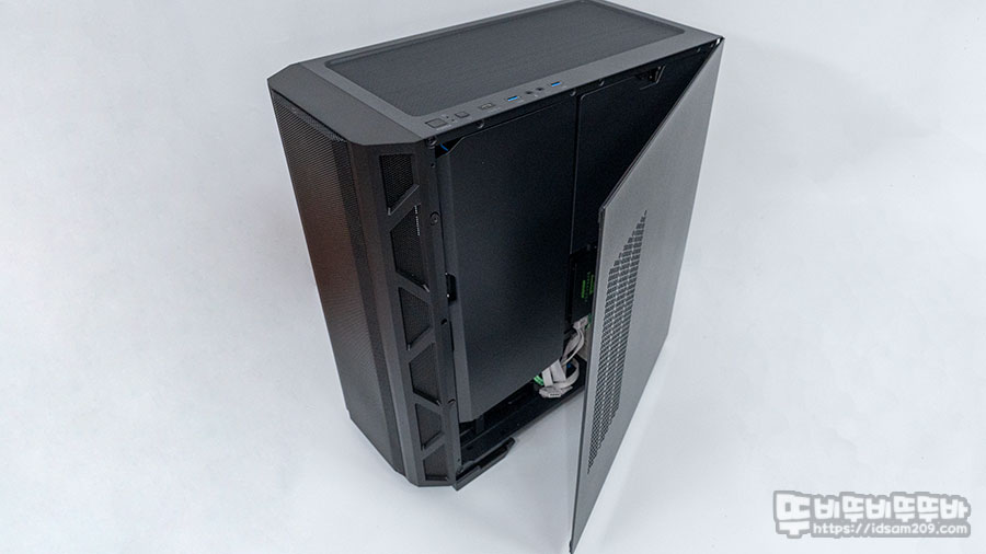 뒤쪽에 위치하게 되는 철재 사이드 패널도 전면에 강화유리 패널과 비슷한 구조로 측면 공기 유입을 위해 타공 처리된 게 특징입니다.