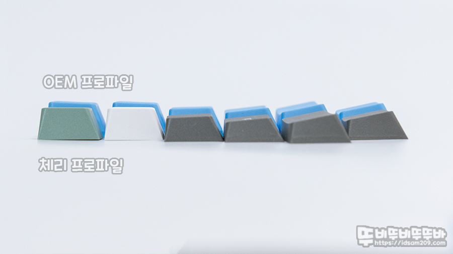 체리 프로파일답게 OEM 프로파일 보다 높이가 낮기에 키보드 타이핑 시 타격점을 더 낮출 수 있는 장점이 있으며 OEM 프로파일을 주로 사용하는 역방향 스위치 제품에는 사용이 불가능하다는 점을 참고하시기 바랍니다.