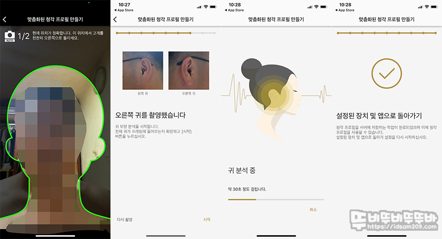공간 사운드 맞춤화의 경우 조금 번거로운 과정을 거치게 되는데 360 Spatial Sound Personalizer 앱을 다운받아 정면 좌우 측면의 귀 모양을 촬영하여 자체 분석을 통환 설정을 클라우드에 저장하여 인존 앱에서 클라우드로 접속하여 저장된 프로파일을 꺼내오는 방식입니다.