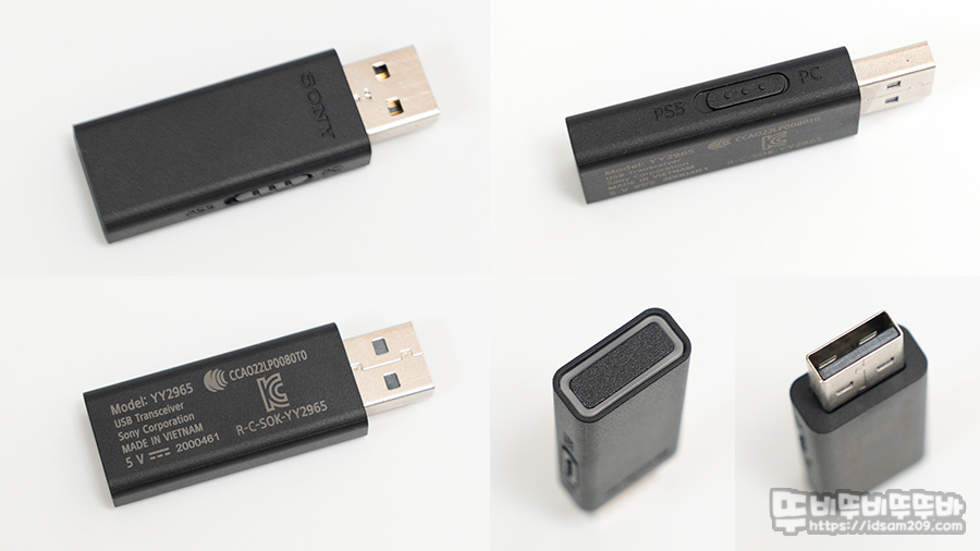 RF 방식의 무선 리시버는 USB-A 단자가 사용된 스틱 디자인으로 측면에 PS5 / PC를 선택 스위치와 스틱 끝부분은 페어링 버튼과 PC 또는 PS5에 연결 시 LED 점등으로 작동 여부를 확인할 수 있는 LED 인디케이터로 디자인되었습니다.