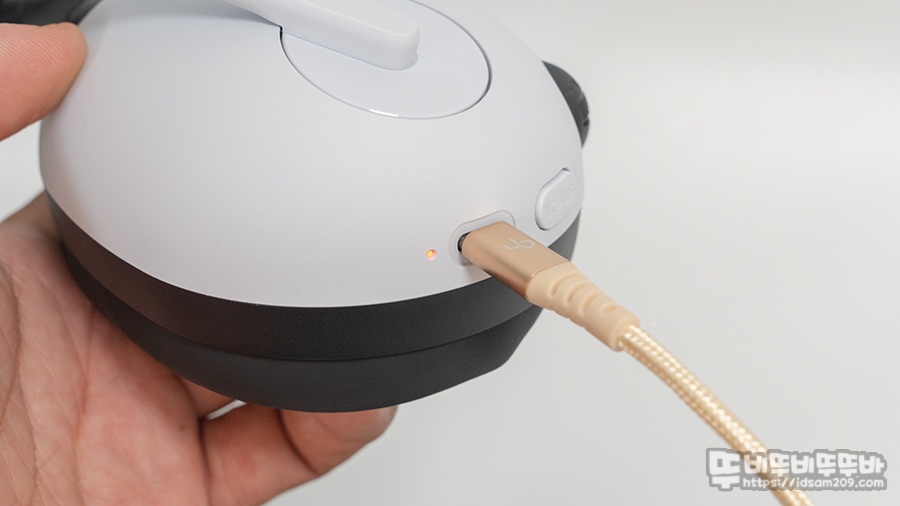 헤어밴드 부분과 이어컵 하우징 연결 부분에는 원형으로 디자인된 LED 인디케이터로 RF 무선 또는 블루투스 연결 상태를 화이트/블루 컬러로 알려줍니다.