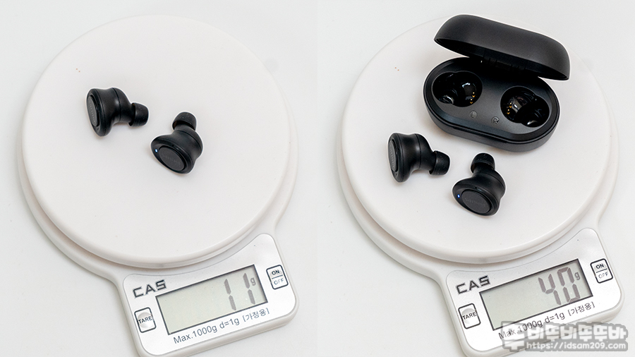 필립스 무선이어폰 TAT1215를 1g 단위로 측정하는 디지털 저울로 측정 시 이어버드는 약 5.5g, 충전 케이스는 39g으로 휴대 및 착용 시 불편함이 없는 무게를 제공합니다.