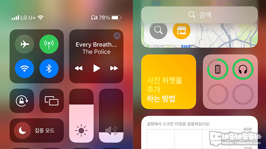 아이폰에서는 위에서 내리는 제스처 메뉴 또는 위젯 메뉴에서 블루투스 이어폰 배터리 잔량 확인을 직관적으로 하실 수 있기에 사용하시는데 도움이 되실 거예요.
