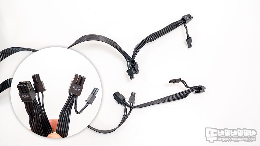 2개의 케이블로 구성된 450+150mm 길이의 PCIe 8핀(6+2) 그래픽카드 보조전원 커넥터 모습.