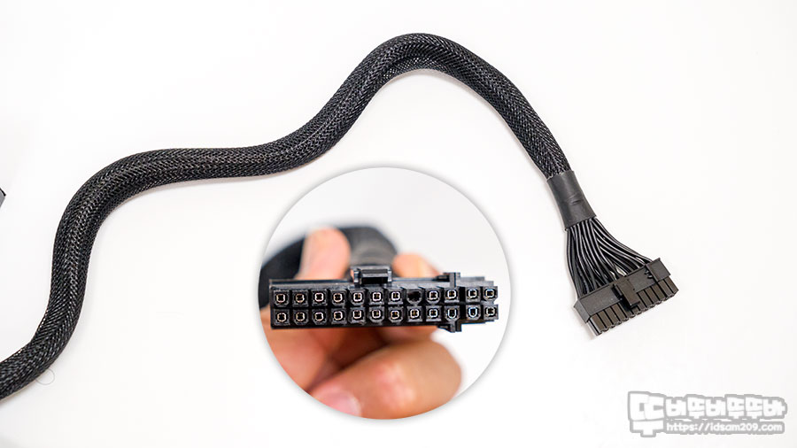 기본적으로 플랫 케이블을 사용하고 있지만 케이블 가닥수가 많은 메인 전원 케이블만 슬리빙 처리가 되어있으며 전체 길이 550mm로 24핀(20+4) 커넥터 1개로 구성을 확인할 수 있고요