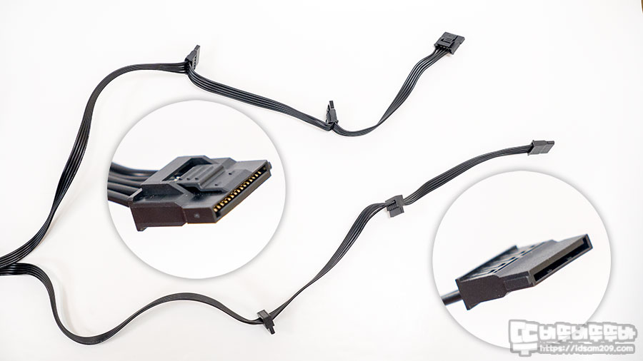 케이블 한쪽에 구성된 SATA 커넥터는 고정력이 좋은 락킹 기능이 있는 커넥터가 사용되었으며, 나머지 케이블에는 락킹 기능이 없는 커넥터가 사용되었으니 연결하는 장치에 따라 구분하여 사용하시면 좋을 거 같습니다.