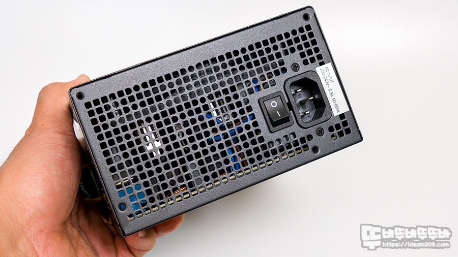 AC 코드가 입력되는 소켓 부분의 전원 스위치와 공기 흐름을 위한 타공 홀 모습.