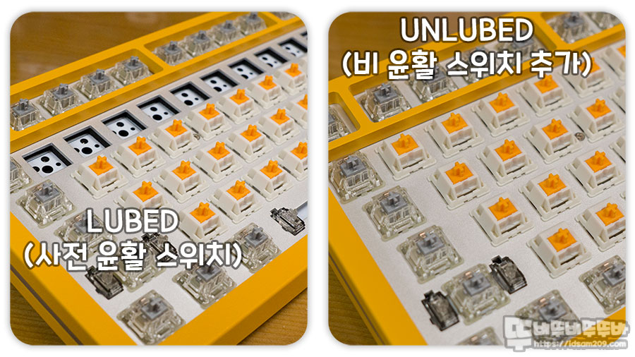 윤활과 비윤활 스위치를 비교하자면 확실히 윤활된 스위치가 부드러운 느낌을 주기에 윤활에 자신이 없으신 분들이라면 LUBED 윤활 스위치를 사용하시는 걸 추천드립니다.