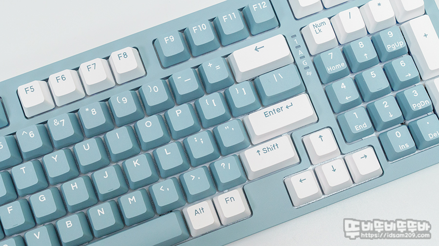 다얼유 A98W 스모키 블루 제품은 시원한 화이트와 블루 컬러의 PBT 키캡이 투톤 느낌 그리고 문자열과 키패드 사이에 방향키가 위치하는 98% 배열의 컴팩트 디자인으로 스페이스 바 우측에 Fn와 방향키 간격이 넓어 문자열 사용 시 키 간격이 넓어 타이핑 시 간섭은 없는 편이지만 표준 배열과 다르게 축소된 만큼 98% 배열의 독특한 레이아웃은 적응이 필요합니다.