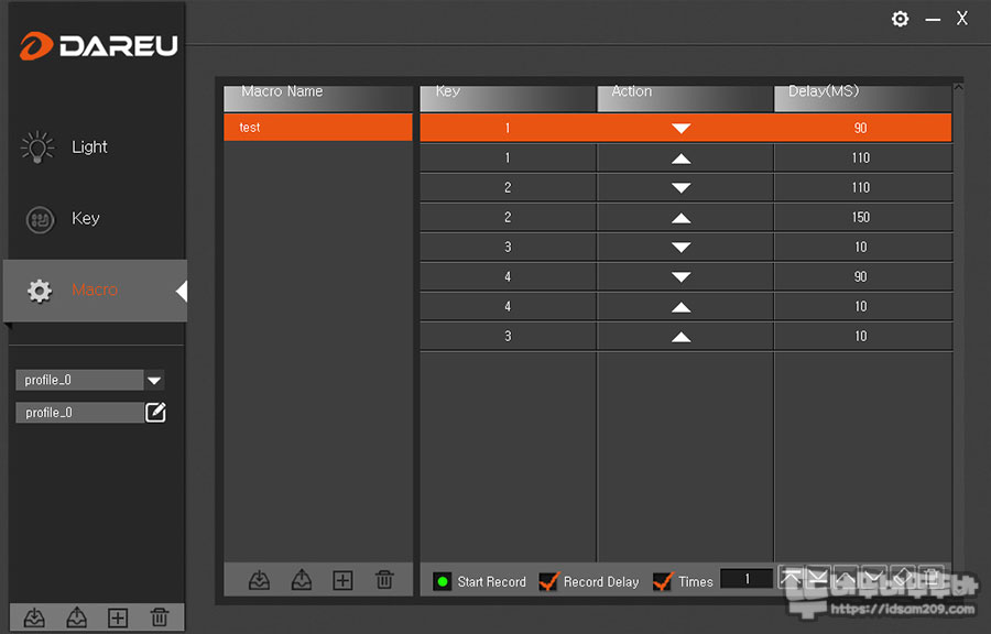 매크로 기능은 여느 키보드나 마우스의 매크로 기능과 비슷하여 매크로 파일명을 생성하고 Strat Record를 선택하여 키 입력으로 매크로 파일을 만드신 후 키 메뉴를 통해 원하는 키에 매크로 기능을 부여하면 되기에 간편하게 사용하실 수 있습니다.