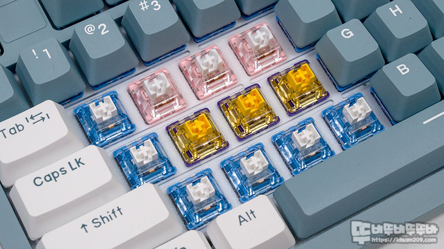 솔직히 화이트/블루 컬러와는 매칭이 되지 않지만 그래도 포인트 느낌을 주는 포인트 키캡을 기본으로 제공하기에 취향에 맞게 적절하게 사용하시면 좋을 거 같네요.