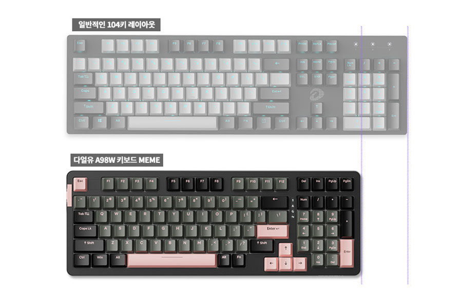 다얼유 A98W 가스켓 퀵스왑 게이밍 기계식 키보드 레이아웃 모습.