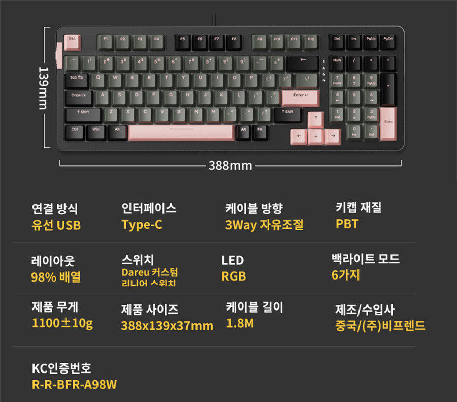 자판과 키패드 사이에 방향키를 넣고 키패드 위로 모디키 4개를 추가한 98% 컴팩트 배열로 USB-C 타입 단자를 사용하는 유선 방식 그리고 PBT 이중사출 키캡, 모든 키 N-Key 롤오버, 다양한 RGB LED 효과, Win/Mac OS 지원 등의 정보를 확인할 수 있습니다.