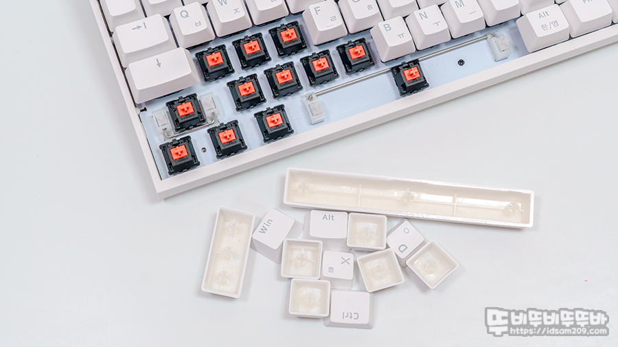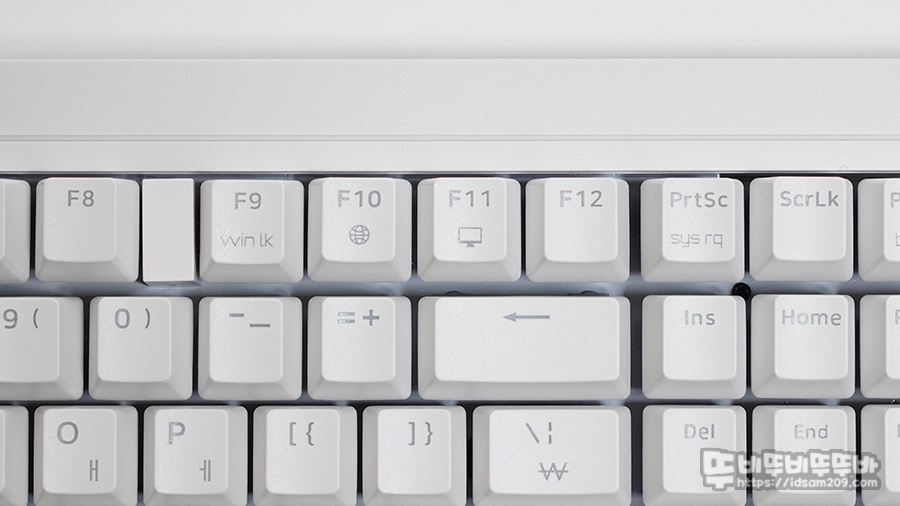 체리 키보드의 아이덴티티라 할 수 있는 무보강 구조 그리고 체리 방식의 스태빌라이저 사용 특히 RGB LED를 지원하지 않는 제품이지만 LED 빛 투과가 가능한 ABS 이중 사출 키캡이 적용이 조금 언밸런스하게 느껴지기도 합니다.