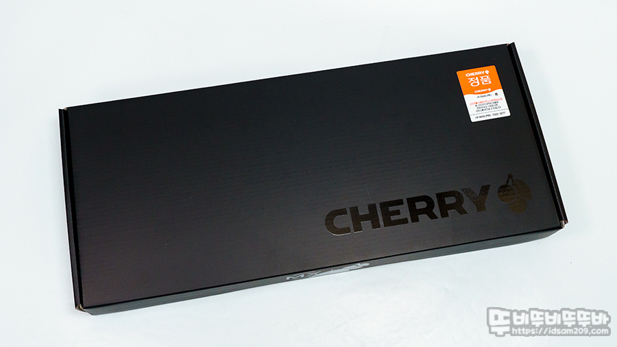 체리 키보드 패키지는 블랙 컬러에 유광으로 표현되는 제품 관련 로고와 아이콘으로 심플함과 유통사 피씨디렉트의 정품 인증 스티커 측면에 제품 정보가 인쇄된 라벨 모습을 확인할 수 있습니다.