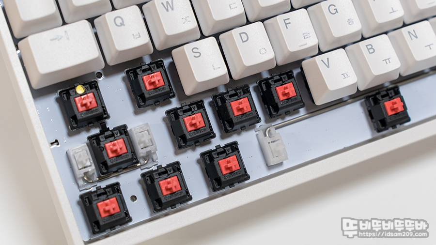 키캡을 제거하면 윤활 적용이 적용된 체리 스태빌라이저 그리고 보강판이 없이 기판에 부착된 저소음 적축 스위치 모습을 확인할 수 있습니다.