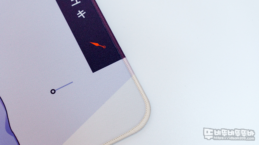 습기에 강한 무코팅 마이크로 섬유 소재의 부드러운 표면에 천연고무가 더해야 약 3mm 두께로 구성된 패드는 독특하게도 오버로크 부분이 패드 표면의 이미지 컬러와 동일하게 적용된 게 특징입니다.