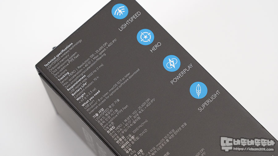 길이 : 125.0 mm / 좌우 폭 : 63.5 mm / 높이: 40.0 mm / 무게 : 63g, 센서 : HERO 25K / DPI : 100 – 25,600 DPI / 최대 가속: > 40G / 최대 속도: > 400 IPS / 제로 스무딩, 가속, 필터링 / 사용 시간 70시간 이외 정보로 내장된 배터리는 240mAh 리튬 폴리머 용량을 확인할 수 있습니다.
