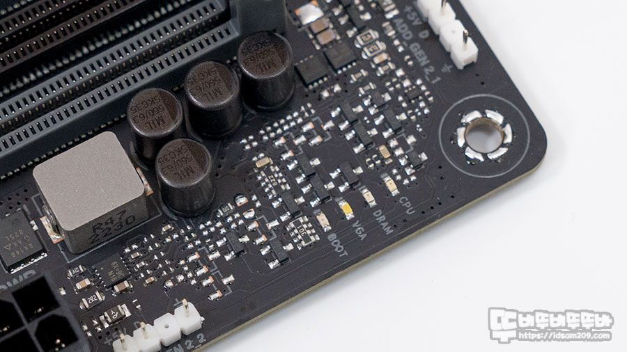 제품의 많은 부분을 사용하는 M.2 SSD는 CPU 아래에 PCIe 5.0을 지원하는 M.2 소켓과 칩셋 아래에 PCIe 3.0을 지원하는 소켓, 그 아래 PCIe 4.0을 지원하는 2개의 소캣으로 구분되어 있는데요.