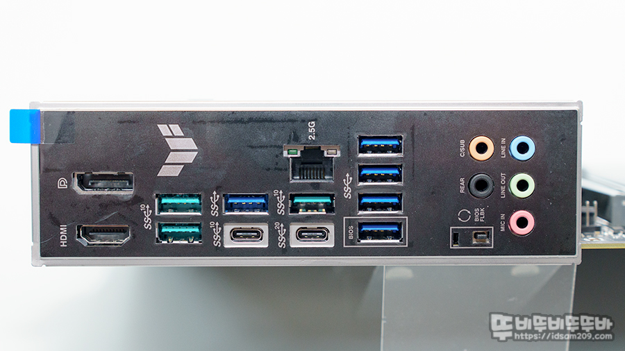 뒷면 I/O 포트는 CPU의 내장 그래픽을 사용할 수 있는 DP 포트 / HDMI 포트 / 초록색으로 보이는 USB 3.2 Gen 2 포트 / 파란색으로 보이는 USB 3.2 Gen 1 포트, USB 3.2 Gen 2 Type-C 포트 2개 / 리얼텍 2.5GB 이더넷 / BIOS FlashBack 버튼과 관련 USB 포트 그리고 가상 7.1 채널을 지원하는 사운드 포트를 확인할 수 있으며 I/O 포트에는 정전기 방전으로 손상을 방지하는 ESD 가이드가 적용되어있어 안심하고 사용할 수 있습니다.