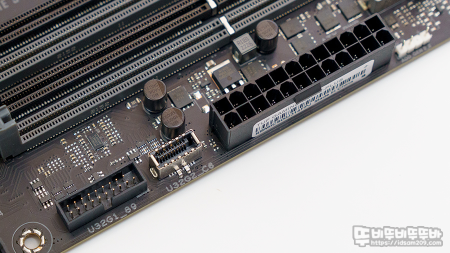 메인보드 하단에 CHA_FAN과 W_Pump 4핀 커넥터 그리고 케이스 I/O 헤더 그 위로 USB4 선더볼트 헤더 구성을 확인할 수 있고요.