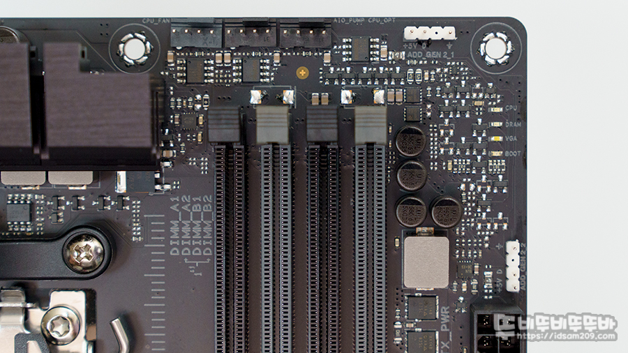 메인보드의 중요 커넥터 부분을 확인해 보면 메인보드 상단에 CPU Fan, AIO Pump, CPU Opt 4핀 커넥터와 +5V ARGB 3핀 커넥터 2개를 확인할 수 있는데 대부분의 PC 튜닝 제품이 +5V ARGB 제품으로 출시되기에 시스템 조립의 편리성을 위해 상단에 몰려있는 구성은 정말 좋은 거 같네요.