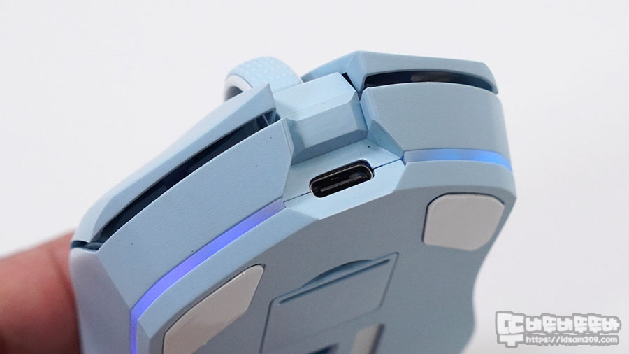 경량형 무게를 위해 도입된 휠 스크롤은 구분감 없이 회전하는 타입이며 마우스 전면에는 충전겸 유선으로 활용할 수 있는 USB-C 단자를 내장하고 있어 유선 사용이 가능합니다.
