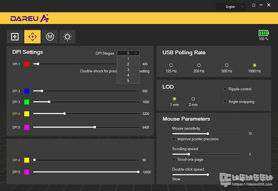 DPI 메뉴에서는 DPI 단계 및 DPI 50~12,000 설정이 가능하며 USB 폴링 레이트 1000Hz 지원과 LOD 및 리플 컨트롤 그리고 앵글 스냅핑 그 외 마우스 기본 기능인 감도 및 스크롤/더블클릭 스피드를 지원합니다.