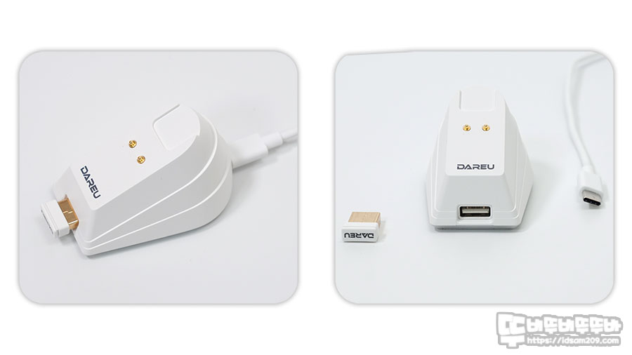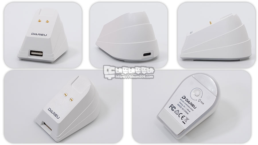 이전에 리뷰했던 A950 무선 게이밍 마우스와 동일한 무선 충전독은 자체 RGB LED 표현을 지원하는 디자인으로 USB-A 타입의 무선 리시버 익스텐더 및 무선 충전 기능을 겸하고 있습니다.