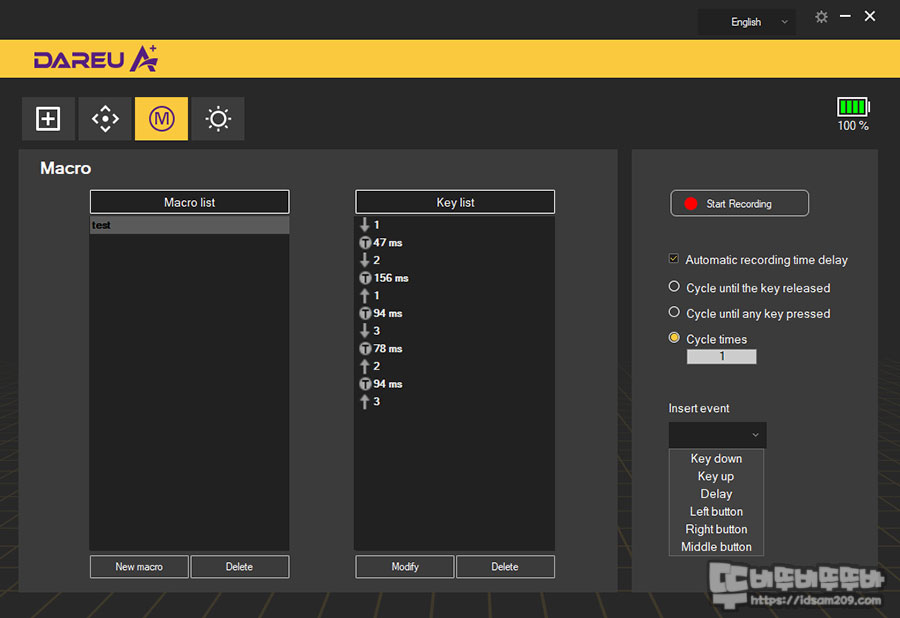 매크로 기능은 매크로 이름 지정 - 녹화 시작 - 키 입력 - 녹화 종료 - 저장 순으로 진행하게 되며 세부적인 키 리스트에 등록된 내용을 마우스 오른쪽 버튼을 눌러 수정과 삭제 기능을 지원하고 있어 사용자가 편리하게 사용할 수 있습니다.