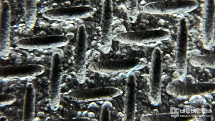 표면을 확대경으로 찍어보면 표면층의 모직이 어떤 구조인지를 가늠하기 힘들었는데 PVC 코팅이 되어있는 상황이라 큰 의미는 없어 보였습니다.