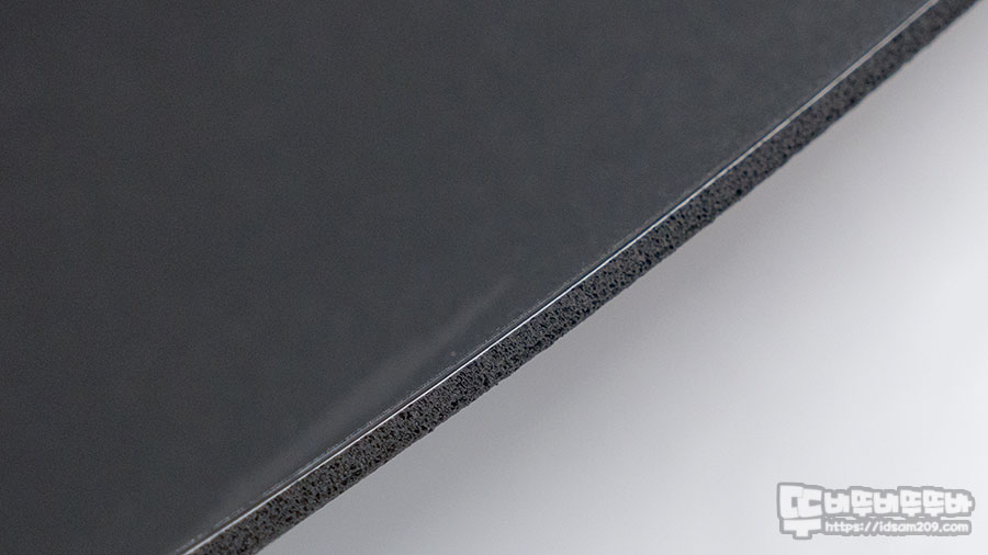 패드의 재질을 상세히 알 수 없지만 패드 상단의 PVC 필름은 압축된 형태의 표면층과 접착이 되어있고 바닥면의 쿠션층 사이에 뭔가 단단한 재질이 사용되어 하드 패드 같은 단단함을 유지해 주고 있습니다.