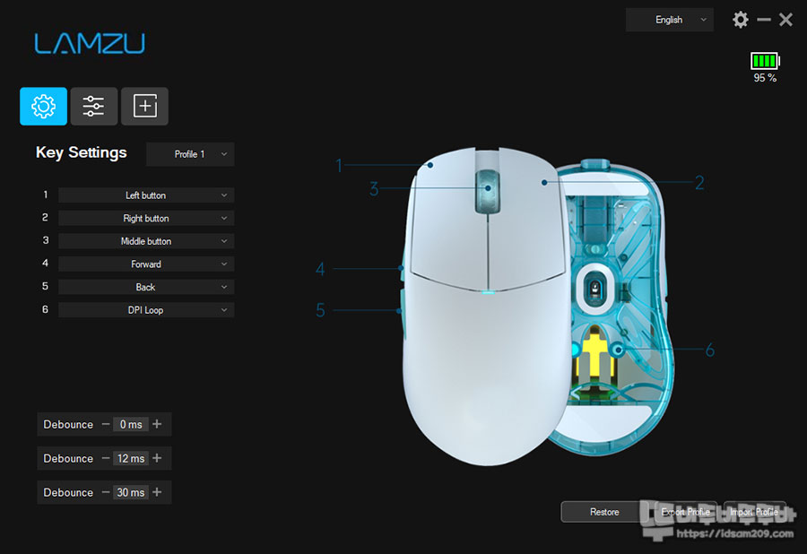 프로그램 왼쪽 하단에는 디바운스 타입 설정이 가능한데 기본값 12ms, 최저 0ms, 최대 30ms로 설정이 가능하고요.