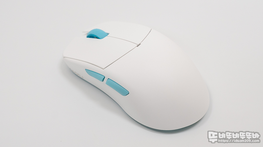 LAMZU(람주) Atlantis Superlight 무선 게이밍 마우스는 대칭형 디자인의 오른손 전용 마우스로 아이스 블루 컬러답게 화이트 하우징과 블루 컬러 버튼 그리고 바닥면에 약간의 타공이 적용된 투명 블루 컬러 플라스틱이 사용되어 시원한 느낌을 줍니다.