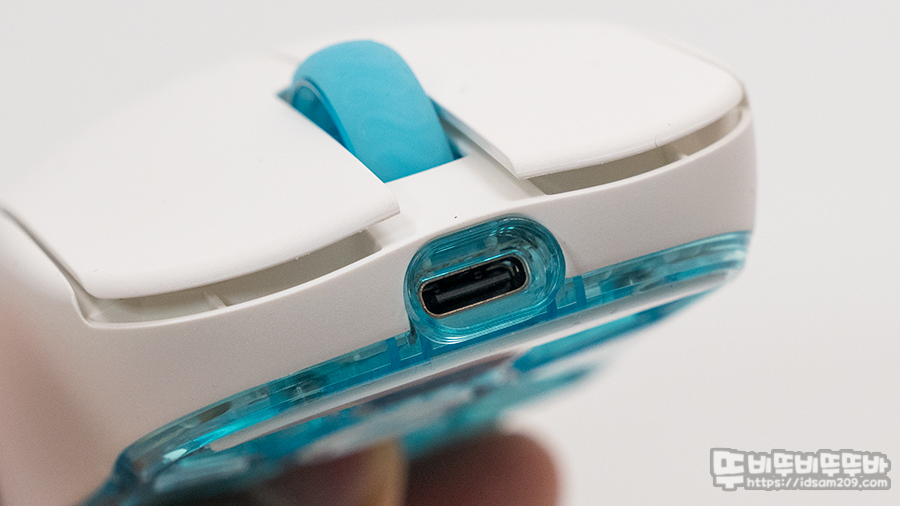 마우스 전면에 위치한 USB-C 단자 모습.