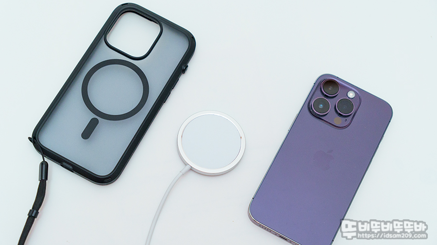 아이폰 14 Pro + 맥세이프 지원 케이스 + 맥세이프 무선 충전기를 사용한다면 안정감 있게 자력으로 잘 부착된 상태에서 충전이 가능합니다.