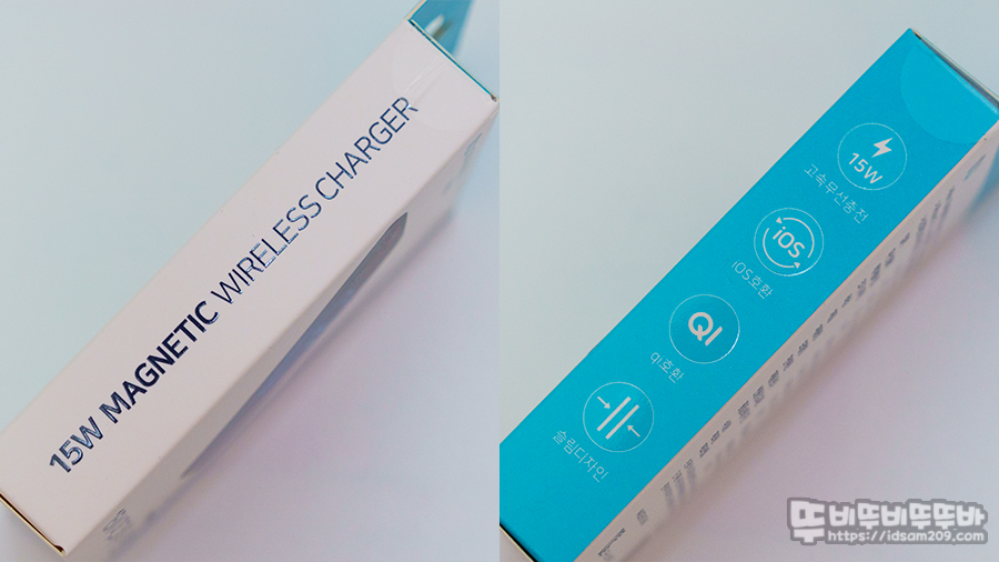 패키지 측면에는 15W 고속무선충전, IOS호환, QI 무선충전 호환, 슬림 디자인 문구를 확인할 수 있습니다.