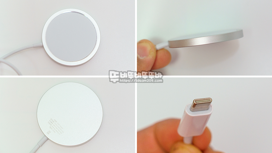 최대 15W 무선 출력, USB-C 타입, 지름 55mm X 높이 5.4mm X 케이블 길이 1.2m, 알루미늄 베이스와 ABS 플라스틱 소재 그리고 맥세이프용 마그네틱이 사용된 게 특징이며 구입일 기준 6개월의 보증기간을 지원하고 있습니다.