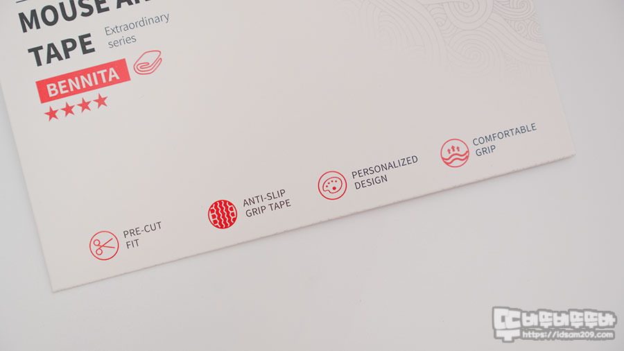 패키지에는 프리컷 피트, 안티 슬립 그립 테이프, 맞춤형 디자인, 편안한 그립 등 제품의 특징이 잘 표현되어 있습니다.
