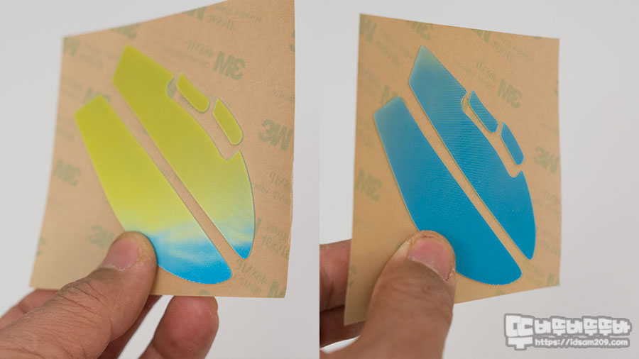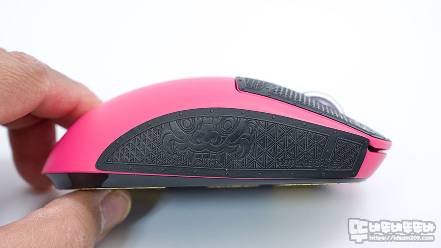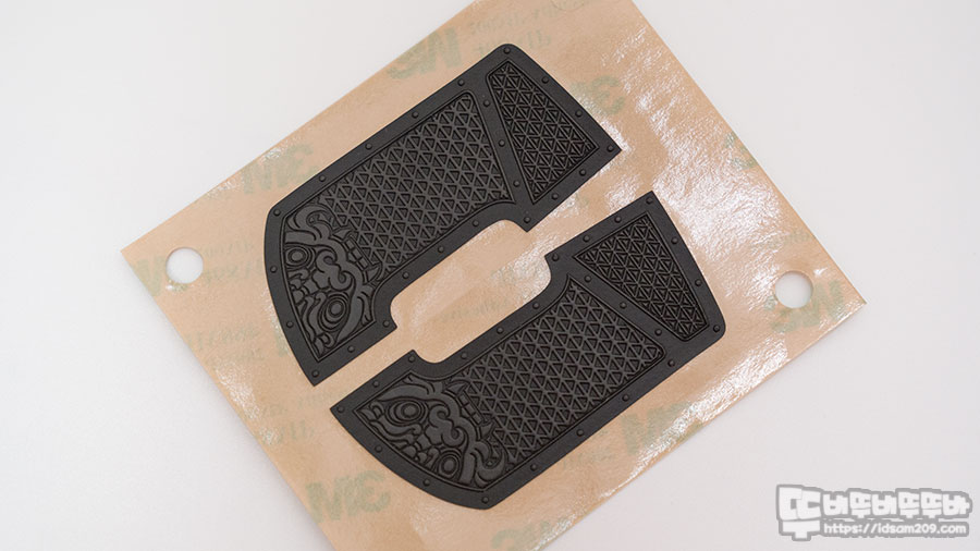 앞서 설명드린 대로 검지와 엄지손가락 위치에 그립패치 삼각형 패턴 디자인이 다르게 적용되어 안정적인 마우스 그립을 지원하며 그립 패치의 두께감이 없어 마우스 하우징 느낌을 선호하시는 분들이 사용하시면 좋을 거 같아요.