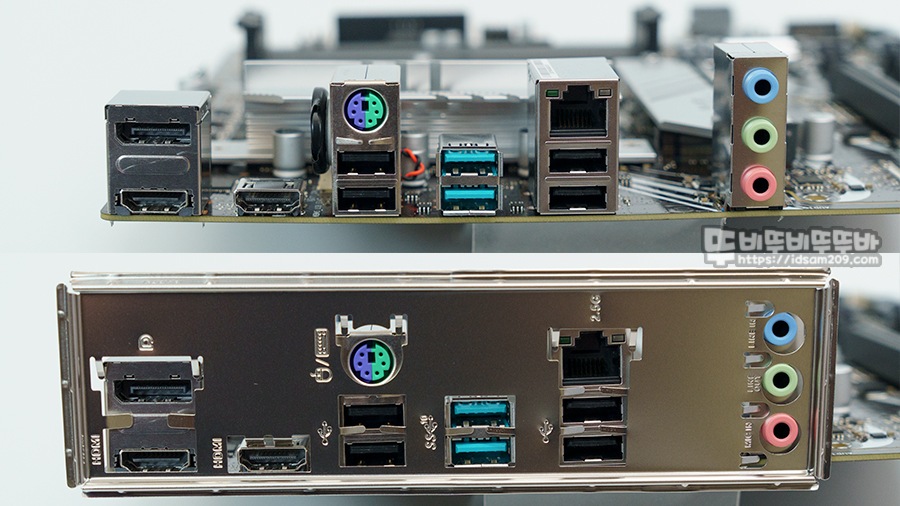 메인보드 뒤쪽의 I/O 포트는 HDMI 2개, DisPlay Port 1개, PS/2 콤보 포트, USB 2.0 포트 4개(검정색), USB 3.2 Gen2 포트 (파란색), 리얼텍 2.5G 이더넷, 라인 입력, 사운드 출력, 마이크 입력으로 구성된 오디오 잭으로 구성으로 부족함 없이 구성되어 있음을 확인할 수 있습니다.