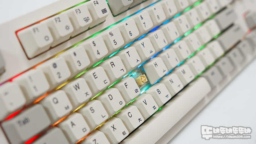 PBT 이중 사출 키캡의 각인 상당히 깔끔하고 퀄리티가 좋은 편인데요. 사진 촬영 시 플래시를 사용해서 밝게 나온 편이지만 실제로는 살짝 노르스름하니 참고하시기 바랍니다.