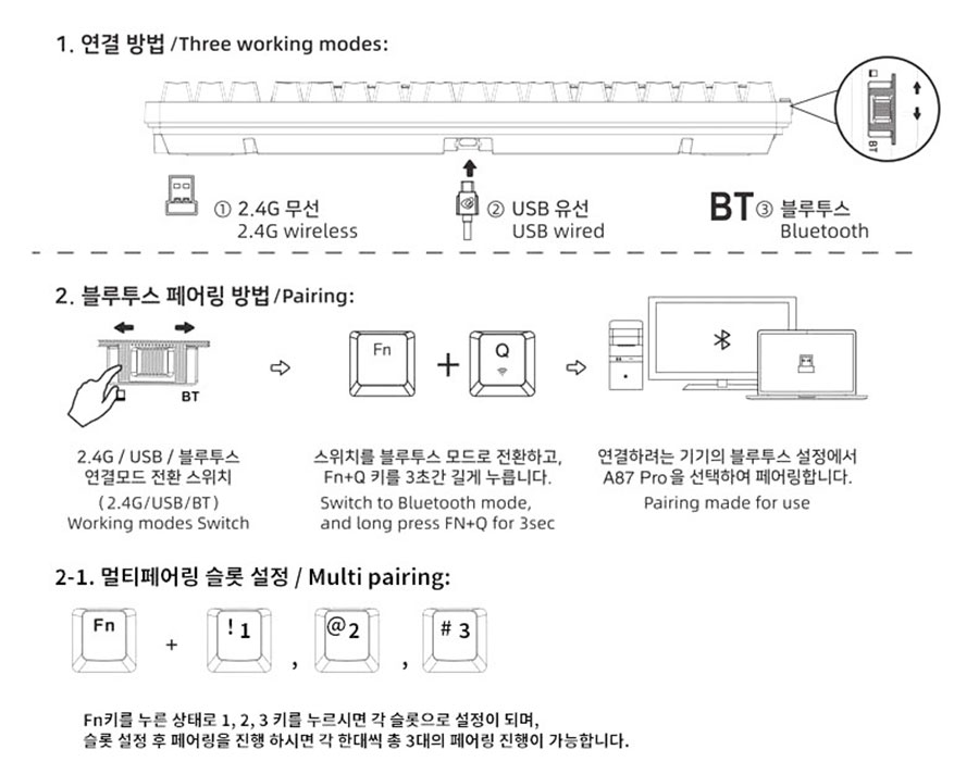 유선이나 RF 2.4GHz 무선 리시버를 연결의 경우는 연결과 동시에 사용이 가능하며 블루투스 연결의 경우 Fn + Q를 선택하여 나타나는 "A87 pro BT Keyboard" 기기 명칭을 선택하여 페어링으로 사용하시기 바라며 멀티페어링 Fn + 1, 2, 3 선택 후 Fn + Q로 각각 서로 다른 기기를 등록 시 빠르게 기기 전환으로 사용이 가능합니다.