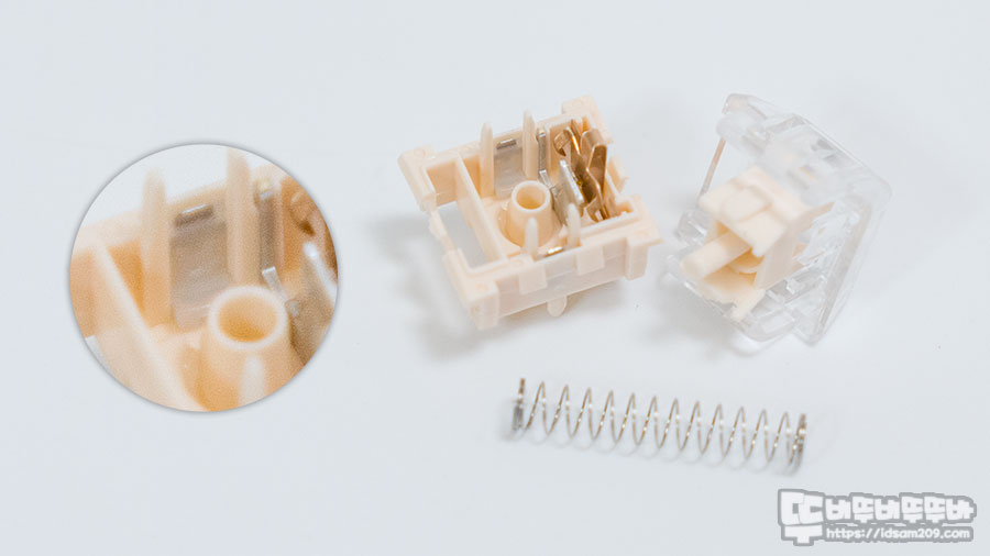 기본적으로 먼지 유입을 방지해 주는 사격형 스템은 넌클릭 효과를 내는 약간의 돌기 그리고 스템에 실리콘 댐퍼가 부착된 체리 저소음 스위치와 다르게 스위치 하부에 실리콘 댐퍼가 부착된 걸 확인할 수 있습니다.