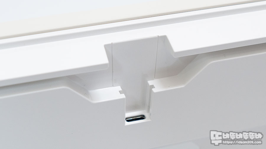 하우징 하판은 건전지가 내장된 제품이라 그런지 살짝 돌출된 디자인이 적용되었는데 그럼에도 2단 높이 조절 다리와 두툼한 미끄럼 방지 패드가 부착되어 있어 키보드 사용 시 밀림을 방지해 줍니다.